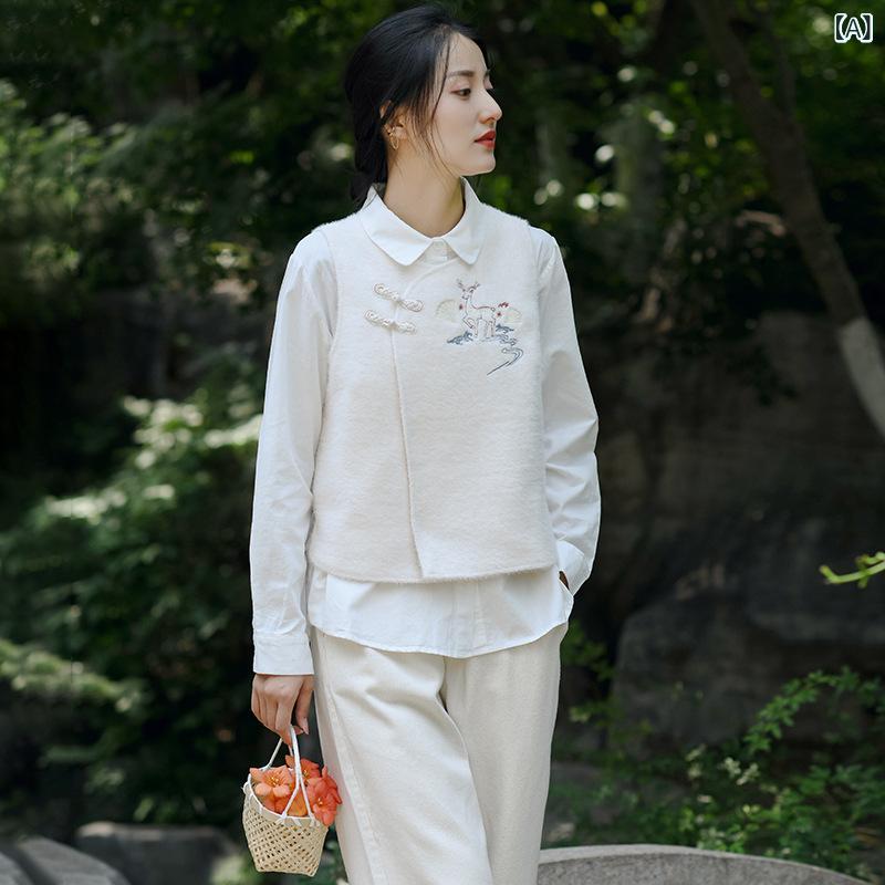 ベスト レディース 秋冬 ネオチャイニーズスタイル ラウンドネック 刺繍 動物モチーフ レイヤード 前開き ポリエステル レトロ調生地 エレガント ジレ ミルキーベージュ ..