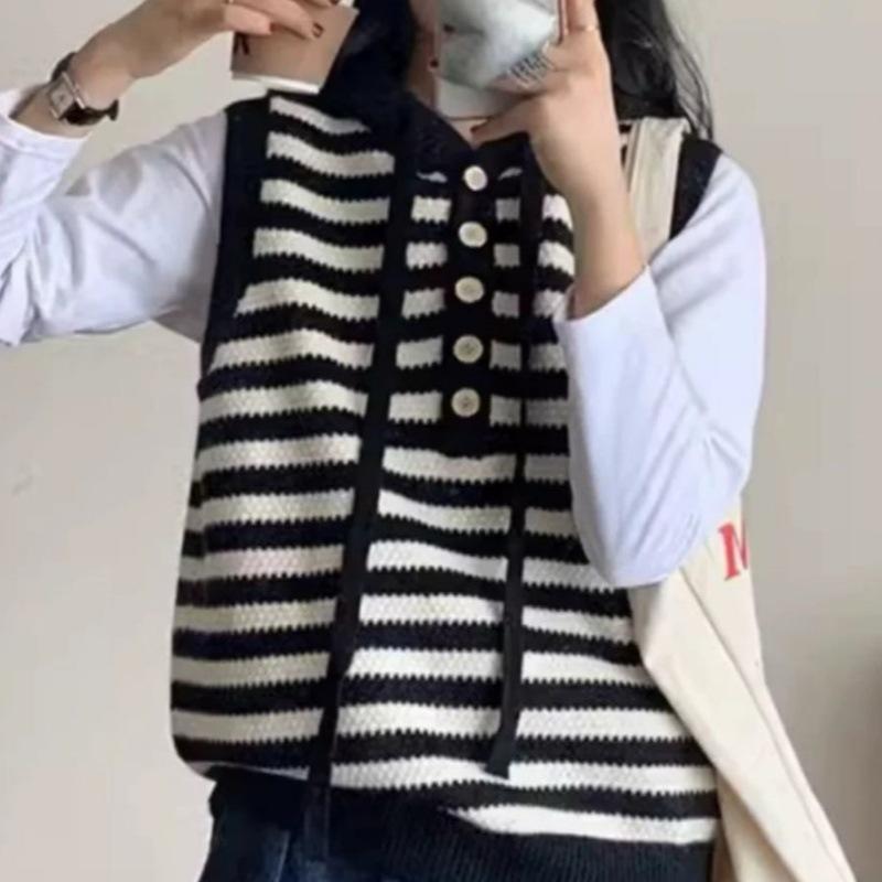 ・カテゴリ: ニット・素材: アクリル、ポリエステル・柄: ストライプ・厚さ: 普通・スタイル: ベーシック、ルーズ・袖丈: ノースリーブ・ネックライン: フード付き・着丈: 普通(50cm超~65cm以下)・カラー: オフホワイト、ブラック、キャメル・サイズ: フリーサイズ・スタイルタイプ: 日韓カジュアル、リラックス・着用方法: プルオーバー・ボタン: シングルブレスト・テイスト: 甘くフレッシュ・主な素材の含有量: 50%-70%・主な素材の含有量2: 30%-50%
