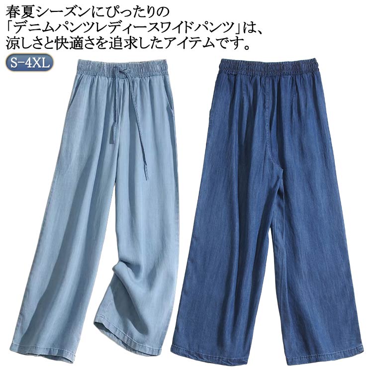 デニムパンツ レディース 大きいサイズ 夏 ワイドパンツ デニム ウェストゴム ハイウェスト 細見え パンツ ロング丈 ひんやり 接触冷感 ロングパンツ 涼しい ジーンズ 夏..