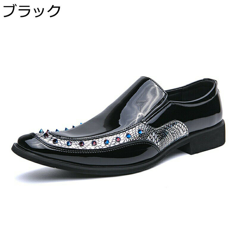 革靴 PUレザー ビジネスシューズ 男性用 紳士靴 ロングノーズ 歩きやすい スリッポン 紐なし ローファー 滑り止め 防水 ポインテッドトゥ 光沢 エナメル リベット 大きい..