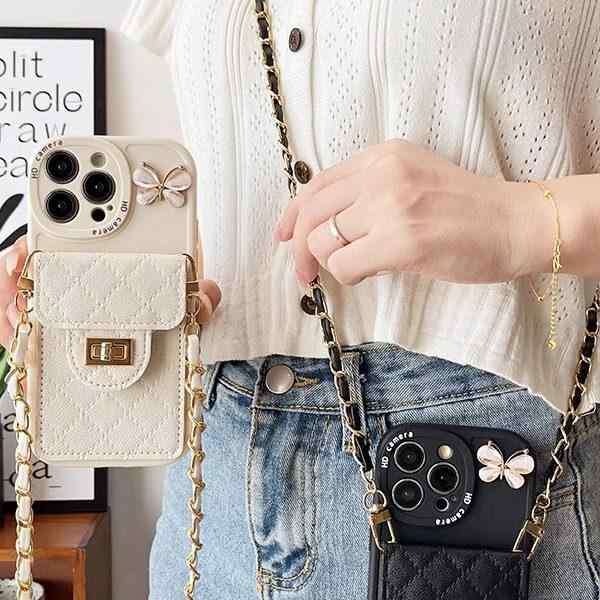 スマホケース おしゃれ シリコン 合皮 キルティング 蝶 ホワイト ブラック ゴールド カードホルダー チェーンストラップ ショルダー 斜め掛け フルカバー 耐衝撃 落下 紛..