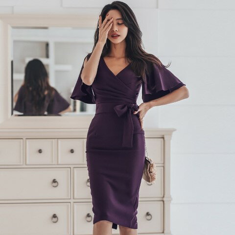 タイトワンピース スリット フリル Vネック スリム 着痩せ 【大きいサイズ レディース 秋冬 結婚式 きれいめ タイト フォーマル 大人 上品 チュニック one-piece】