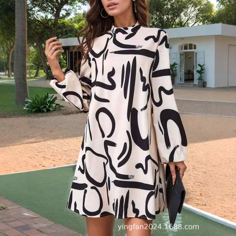 ワンピース レディース 大きいサイズ 幾何学模様 プリント 長袖 Aライン ミディ丈 ポリエステル 杏色 ゆったり 日韓スタイル 普段着