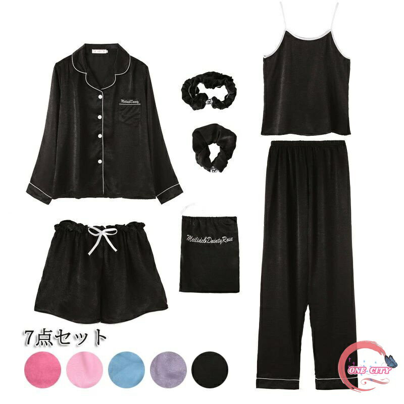 レディース パイピング サテン パジャマ 前開き 長袖 7点セット シンプル 無地 光沢 シルク タッチキャミソール ショーパン 寝間着 部屋着 ナイトウェア