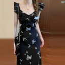 シャツワンピ シャツワンピ ロング マキシ マキシワンピース フランスの 黒 蝶 花柄 ドレス 女性用 夏 2025 新型 高級 小 飛 袖 ホリデー スタイル ロング