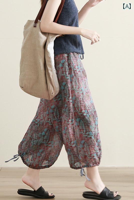 レディース カジュアル パンツ ボトムス ゆったり 快適 普段使い ママ ズボン 女性用 薄手 ラミー プリント ワイド レッグ リネン ストレート コットンリネン 九分丈