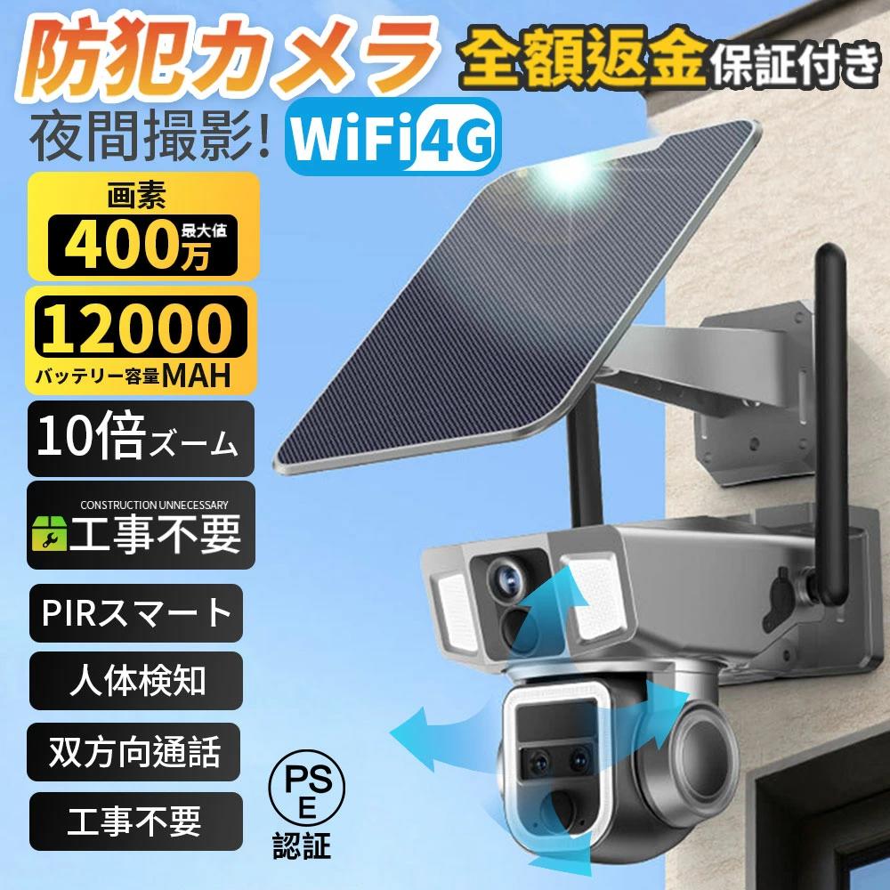 ソーラー 屋外 家庭用 ソーラー ワイヤレス 400万画素 wifi 4G 12000MAH 10倍ズーム デュアルレンズ デュアル画面 監視カメラ 高容量 PIRスマート人体検知 電源不要 録画..