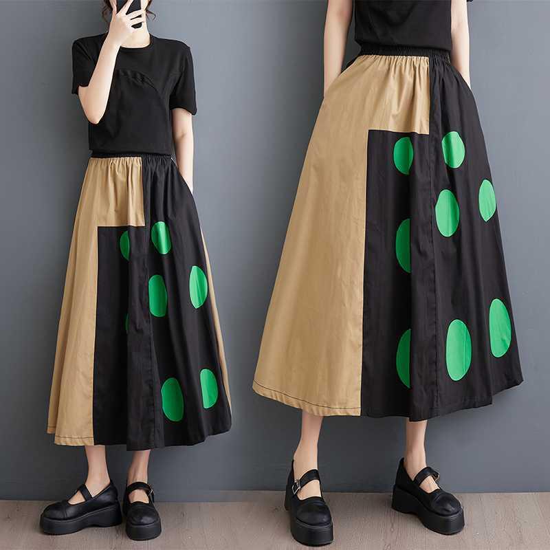 スカート レディース 春秋 韓国風 ゆったり 大きいサイズ 切り替え デザイン プリント柄 ミモレ丈 ミディ丈 着回し 普段使い カジュアル ブラック アクリル素材(x2)