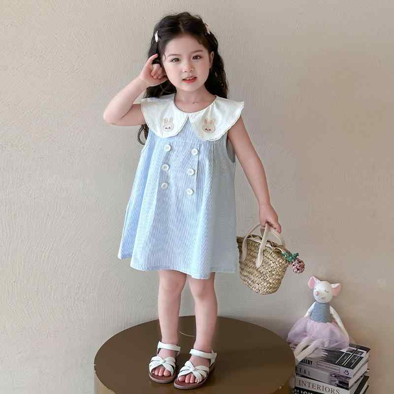 ワンピース 女の子 キッズ ベビー ノースリーブ 韓国風 プリンセスドレス コットン おしゃれ 夏 ブルー カートゥーン柄 3-8歳 100-140cm