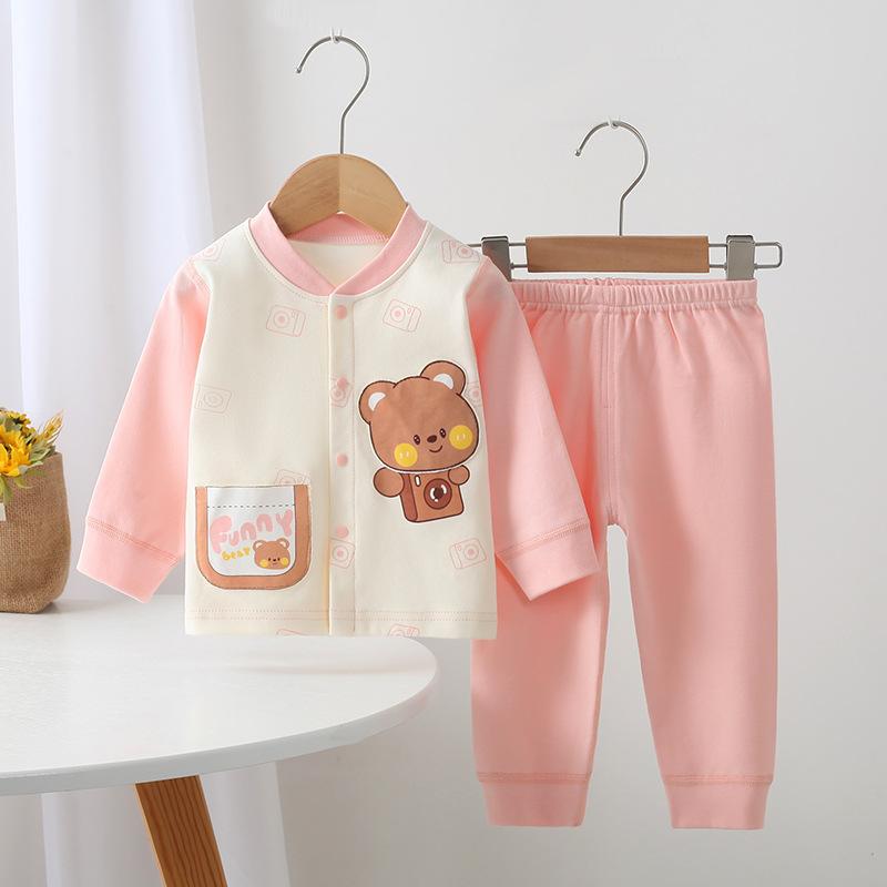 ・安全基準: Aクラス・性別: 男女兼用・対象年齢: 1~3歳児・ネックライン: Vネック・生地加工: 柔軟加工・厚さ: 普通・柄: キャラクター・スタイル: セットアップ・主な素材: 綿100%・機能: 保温・カラー展開: ピンク、カーキ、ブルー・身長展開: 73cm、80cm、90cm・カテゴリ: 子供用肌着