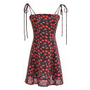 ワンピース レディース フレンチレトロ チェリー柄プリント スリム見え ウエストリボン ハイウエスト キャミソール ミニ丈 春夏 ポリエステル素材 伸縮性 きれいめ カジ..