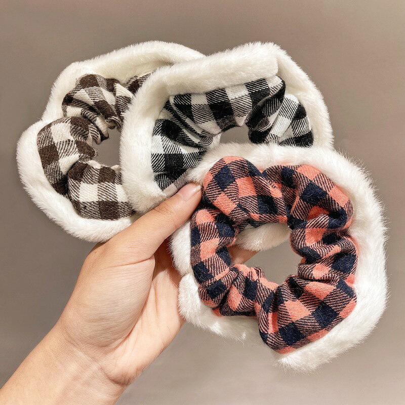 シュシュ チェック柄 全3色 ファー付き クリスマス ヘアゴム 普段使い 黒 赤 茶 ヘアアクセサリー 髪留め パーティー 可愛い オフィス キュート ヘアアレンジ アップスタ..