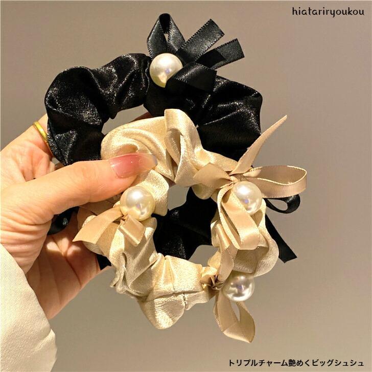 シュシュ トリプルチャーム艶めくビッグシュシュ 大人 かわいい ヘアゴム アップ 30代 40代 50代 ガーリー プレゼント ヘアアレンジ
