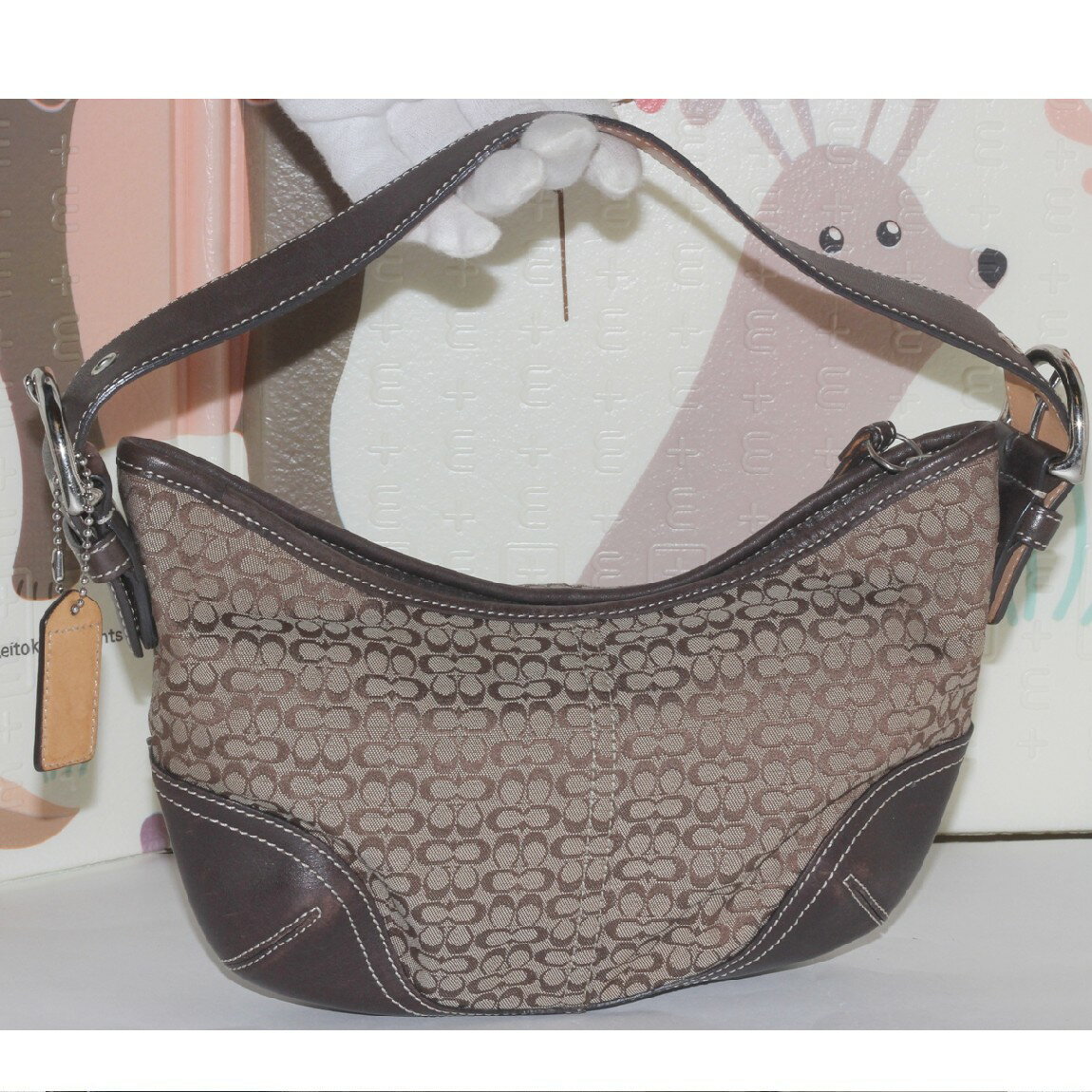 ビンテージコーチの女性用茶色ミニシグネチャー模様ナイロンキャンバス素材に焦げ茶色革素材を使用しているセミショルダートートバッグ6351の出品です。サイズはW28H17D5cmで白いステッチが施されている幅2cmのショルダーの長さは最長38cm位で3段階の調節可能です。開閉部分はファスナー式で中は焦げ茶色の素材で20cm位のファスナー付きポケットがついています。購入は直営店で付属品はチャームです。焦げ茶色の革素材に白いステッチが全体に施されているお洒落なフォルムのトートバッグです。元々野球のグローブの素材を使って作られているバッグでお手入れをすれば長い間使用可能です。全体的に綺麗な状態ですのでお勧めです。管理番号○C5-747