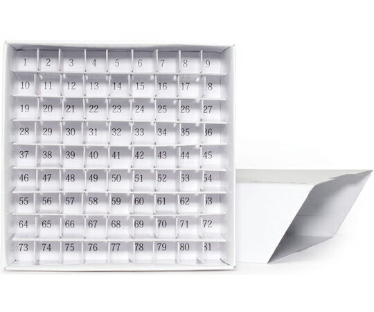 ●クライオチューブ、凍結保存チューブなどを保管するのに便利●フタはスライド式のため、フタごと持ち上げても大丈夫●かぶせ式フタのフリーズボックスでよくある、フタを持ち上げた際に中のチューブがバラバラと落下してしまうというトラブルを回避●ディープフリーザー、液体窒素内で使用可能●耐水効果により長くお使い頂けます。●油性ペン・各種マーカー使用可能●汚れに強く、霜もとれやすい仕様●底面番号付き●ドレイン(排出口)はございません。●81本立て●Wellのサイズ:14×14mm●外寸(W×D×H):134×137×49mm●内寸(W×D×H):132×135×49mm●材質(本体):紙●材質(ラック):紙●収納本数:81本●入数:10箱