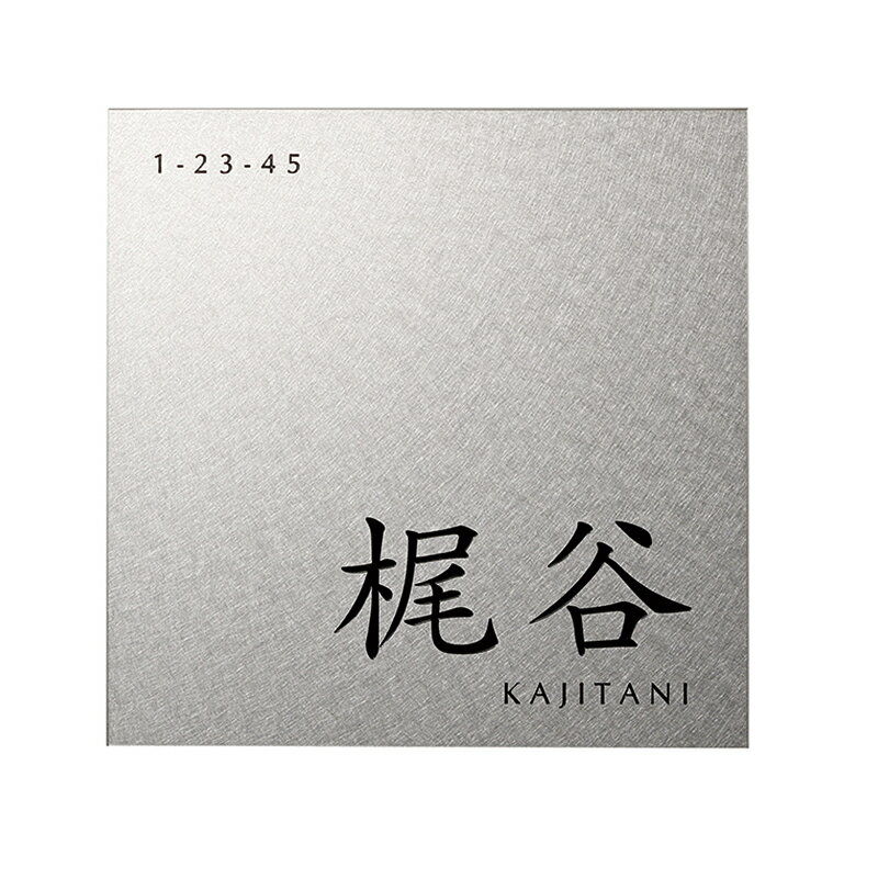 ★文字色は4種類からお選びください。 (黒・グレー・ホワイト・シルバー)コンビでも可能です。 サンプル画像の詳細 サイズ W150×H150×D12 mm 重量 0.7 kg 材質 ステンレス表面:ランダムヘアライン/側面:鏡面 レイアウト レイアウト3 見本書体 和文:(5)楷書体欧文:(G)Optimum 仕様 付属品:専用ドライバー裏面に取付金具を標準装備 取付方法 取付け方法:ビス/ボンド 納期 校正校了後 約2週間 メーカー直送品 沖縄・離島は送料別途です。表札 > オンリーワン > 金属 >