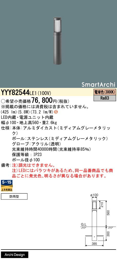 YYY82544LE1YYY82544LE1屋外灯 ポールライト LED SmartArchi(スマートアーキ)電気工事必要 畳数設定無し器具分類 エクステリア・アウトドアメーカー器具名称 フットライトランプ種類 発光ダイオード(LED)総ワット数 5.8本体材質・仕上・色 アルミダイカスト本体(ミディアムグレーメタリック)・ステンレスポール(ミディアムグレーメタリック)・アクリルグローブ(透明)製品重量 2.6寸法 幅φ100・地上高560関連商品: