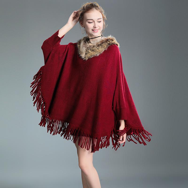 ニット レディース ドルマンスリーブ フリンジ ポンチョ風 フェイクファー襟 Vネック カシミヤタッチ ゆったり オーバーサイズ ミドル丈 チュニック丈 きれいめ エレガン..
