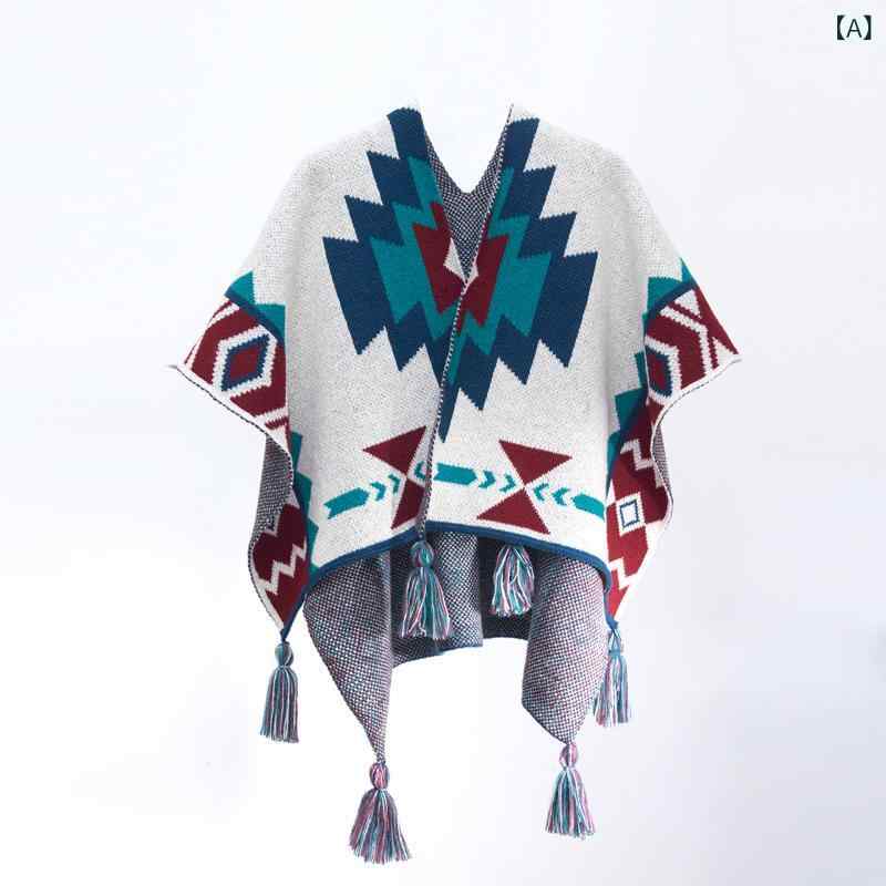 ショール レディース ポンチョ ケープ ニット 羽織り ロング丈 フリンジ 高級感 エスニック レトロ ボヘミアン柄 幾何学模様 フェイクカシミヤ カシミヤタッチ 暖かい 防..